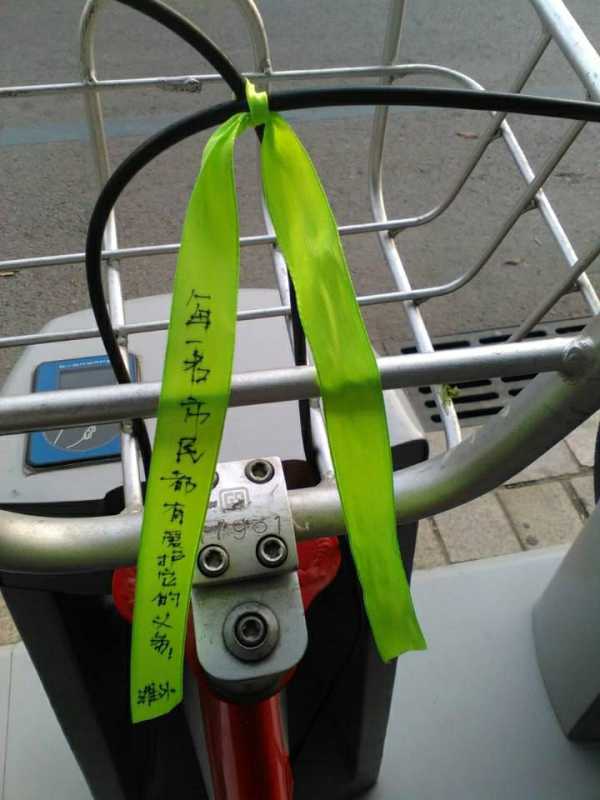 市公共自行車管理中心的一名工作人員表示,市民的這種愛心之舉可行,提醒大家愛護(hù)公共自行車。寫有愛護(hù)語的綠絲帶綁在車筐上面,并不影響公共自行車的使用,綠絲帶比較短,也不會(huì)存在危險(xiǎn)因素。