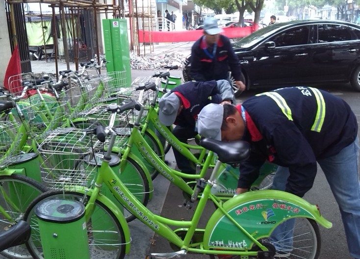 多輛公共自行車進(jìn)行檢查、維修等養(yǎng)護(hù)作業(yè),確保市民騎行安全。
