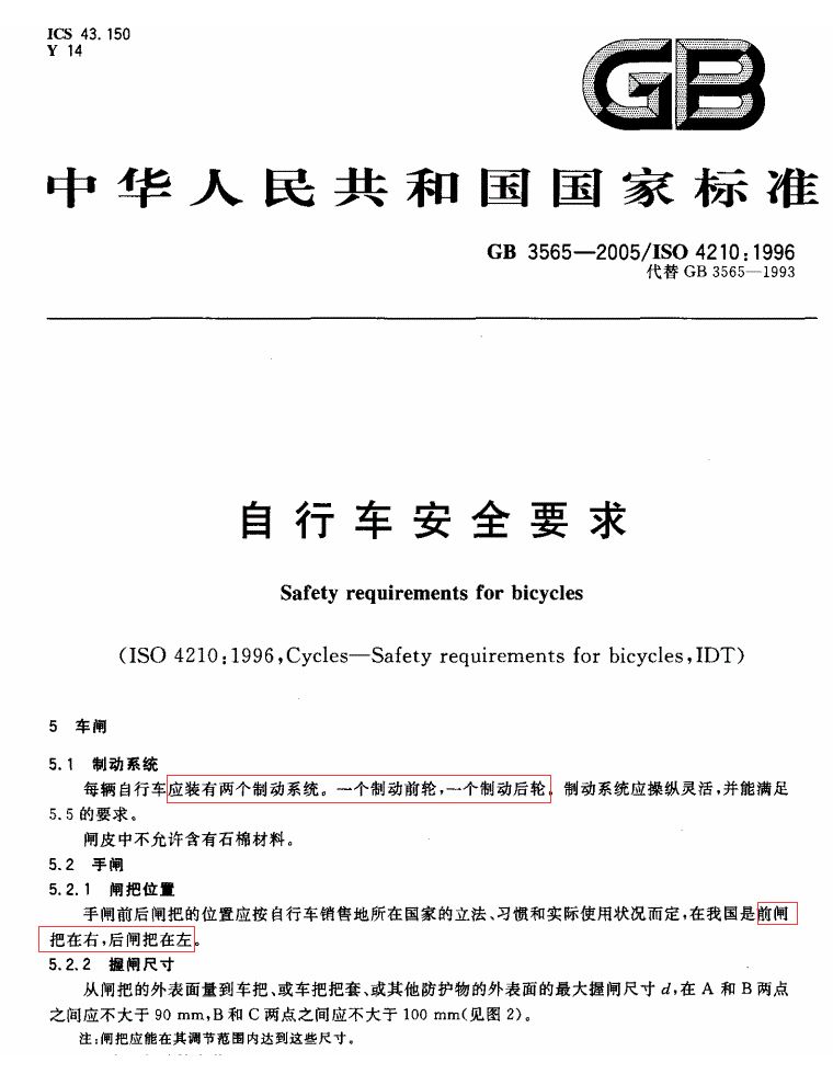 其實(shí),在《中華人民共和國(guó)國(guó)家標(biāo)準(zhǔn)》關(guān)于“自行車(chē)安全的要求”中,我國(guó)對(duì)自行車(chē)的剎車(chē)有著明確且統(tǒng)一的標(biāo)準(zhǔn)和規(guī)定: