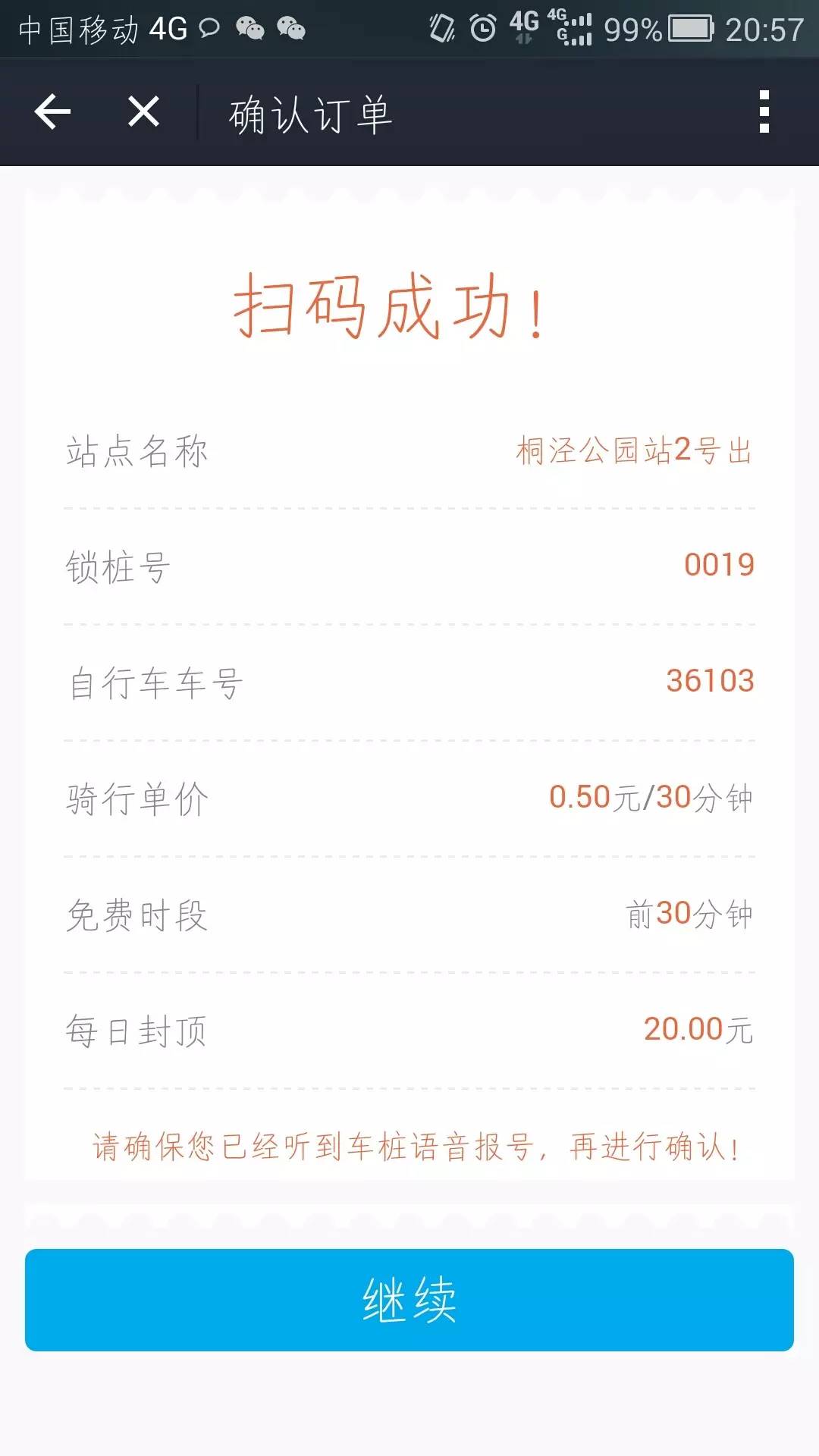 掃碼成功后鎖車樁會(huì)語(yǔ)音報(bào)號(hào),確認(rèn)后也就借車成功了。 還車不用掃碼,只要鎖車樁提示還車成功就可以。 這個(gè)真的可以有!相當(dāng)方便,有時(shí)候忘記帶卡,或者壓根兒就沒有卡的蘇州小伙伴,你們的交通工具就在你們面前。 目前已開通50個(gè)站臺(tái) 芝麻信用分掃碼租車還在試點(diǎn)階段, 古城區(qū)地鐵1號(hào)線、2號(hào)線沿線以及觀前地區(qū)的50個(gè)站點(diǎn)都可以。 “芝麻信用分”在600分以上的市民均可以實(shí)現(xiàn) 免保證金租車,半小時(shí)內(nèi)免費(fèi),超過半小時(shí)按0.5元/30分鐘計(jì)算,以此類推。 如果在借車過程中出現(xiàn)借車或還車不成功,也不要慌,除了可以撥打租車頁(yè)面的400電話,還可以撥打蘇州公共自行車的服務(wù)熱線。 哎呦不錯(cuò)哦 這個(gè)周末出行 趕緊用起來吧~