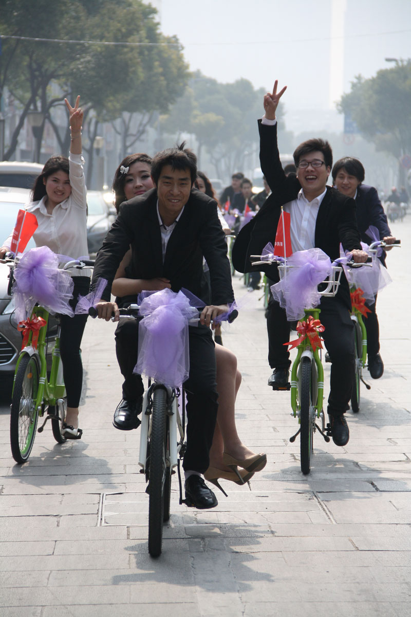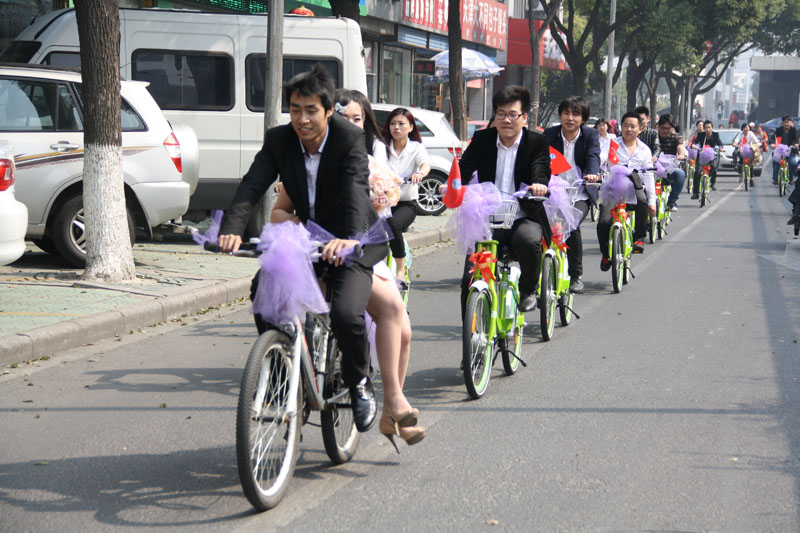 今天上午,專(zhuān)做婚慶活動(dòng)的山東小伙為自己辦了一場(chǎng)低碳而又浪漫的自行車(chē)婚禮,20輛草綠色的公共自行車(chē)組成了“豪華”車(chē)隊(duì),迎娶他那美麗的新娘。