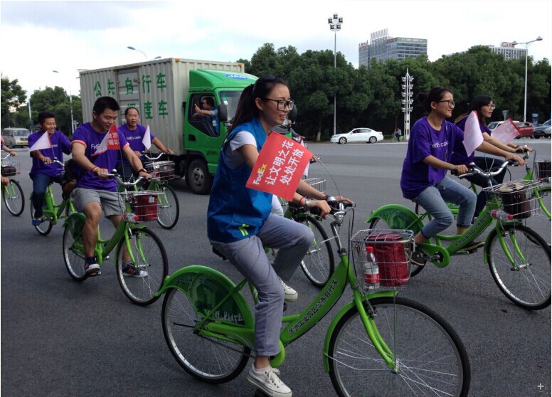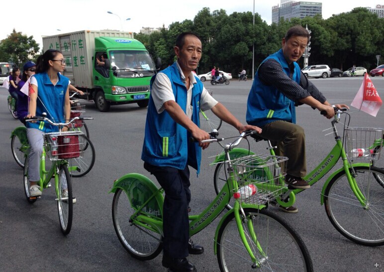 這次活動準備了30輛綠色自行車,掛上環(huán)保旗幟。沿著園區(qū)的主干道進行了1~2小時的騎行。騎行隊伍分為兩支,一支主要圍繞湖西商業(yè)中心進行騎行,一支圍繞湖東圓融廣場騎行。沿路向環(huán)衛(wèi)工人等戶外工作人員發(fā)放愛心禮品。