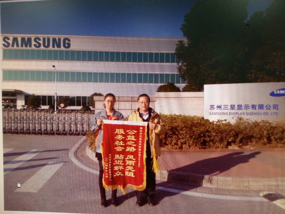 2014年12月22日下午,公司領(lǐng)導(dǎo)為三星液晶顯示器的工作人員贈(zèng)送錦旗。對他們?yōu)楣沧孕熊嚬芾砉ぷ鞯闹С直硎靖兄x。幾年來,風(fēng)雨無阻堅(jiān)持為自行車做保潔。讓美麗的蘇城更增添了靚麗的風(fēng)景線。