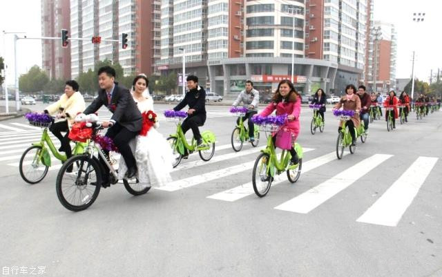 用公共自行車(chē)代替?zhèn)鹘y(tǒng)婚車(chē),沒(méi)有豪車(chē),沒(méi)有奢華的場(chǎng)面,但親友團(tuán)們組成的自行車(chē)陣,也賺足了市民的眼球,贏得百分百的回頭率。在高檔婚車(chē)“熱”的當(dāng)下,低碳、環(huán)保的公共自行車(chē)迎親隊(duì)伍猶如雨后一抹新綠,讓人眼前一亮。這種浪漫的結(jié)婚方式讓婚禮變得更有意義。