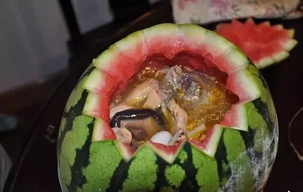 西瓜雞曾在蘇州當(dāng)?shù)爻掷m(xù)風(fēng)靡四五十年,因著只能在夏天吃,且必須當(dāng)天烹煮當(dāng)天吃,不能貯存又無法攜帶,因此知道的人還真不那么多。西瓜與母雞共蒸,瓜的清香滲入雞肉,雞肉又能保持原有的鮮嫩,考究點(diǎn)的店家還會在西瓜皮上雕圖刻畫,極富美味與觀賞性。