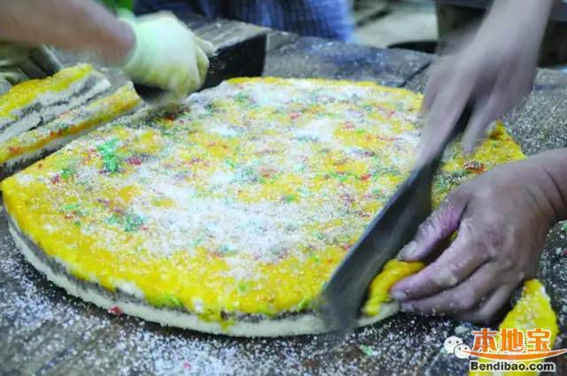 黃天源的師傅們,摒棄了人工合成色素,而是采用紅曲、薄荷、青菜汁、蛋黃、赤豆沙以及玫瑰花等自然色素配制而成,撒上紅綠絲,然后再撒上一些晶瑩潔白的白砂糖,這樣做出來的黃天源重陽糕看起來五彩繽紛,讓人垂涎欲滴。