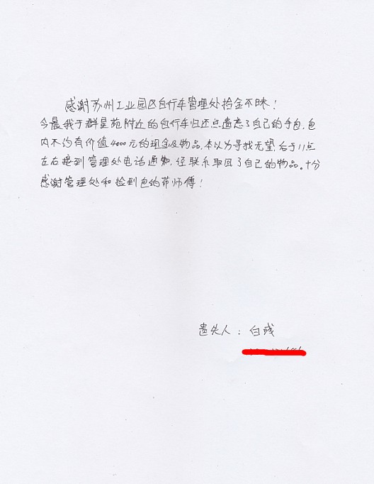 失主認領后非常感動隨及拿出一部分作為酬謝,被茆師傅和李師傅婉言拒絕!失主非常感動,他說:“我是從北京到蘇州旅游的。今天在園區(qū)金雞湖附近游玩不慎將包遺忘了。本以為找不到了,沒想到不超過2小時你們就聯(lián)系到我了,非常感謝你們。蘇州園林真美、蘇州市民的素質(zhì)真高!”