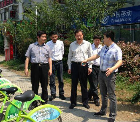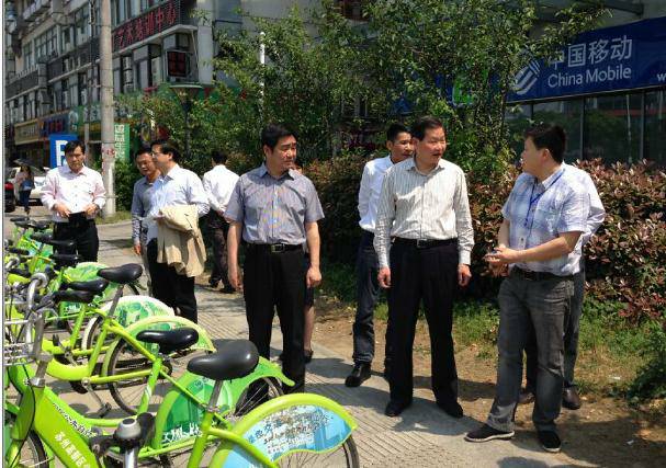 蘇州市政協(xié)主席于2015年4月27日在蘇州市容市政局金局、湯局的陪同下,調(diào)研蘇州公共自行車,運營公司劉總為政協(xié)主席介紹蘇州公共自行車的發(fā)展及規(guī)劃。