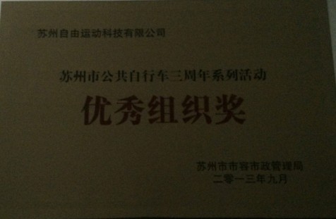 為倡導(dǎo)“低碳生活,綠色出行”理念,進(jìn)一步鞏固和提升我市公共自行車服務(wù)與管理水平,按照我市開展無(wú)車日活動(dòng)工作的統(tǒng)一部署,結(jié)合《“綠色蘇州夢(mèng) 我們?cè)谛袆?dòng)” 蘇州公共自行車啟用三周年系列活動(dòng)方案》,蘇州市市容市政管理局于2013年4月---9月開展了蘇州市公共自行車啟用三周年系列活動(dòng)。在各級(jí)部門的廣泛發(fā)動(dòng)和認(rèn)真組織下,活動(dòng)取得了圓滿成功。本次活動(dòng)得到了社會(huì)各方的關(guān)心和支持,也得到了市民群眾的熱烈響應(yīng)和參與積極,有效傳播了“綠色出行”理念和公共自行車文化,取得了良好的社會(huì)效果。在此次活動(dòng)中我公司被授予“優(yōu)秀組織獎(jiǎng)”的榮譽(yù)稱號(hào)。