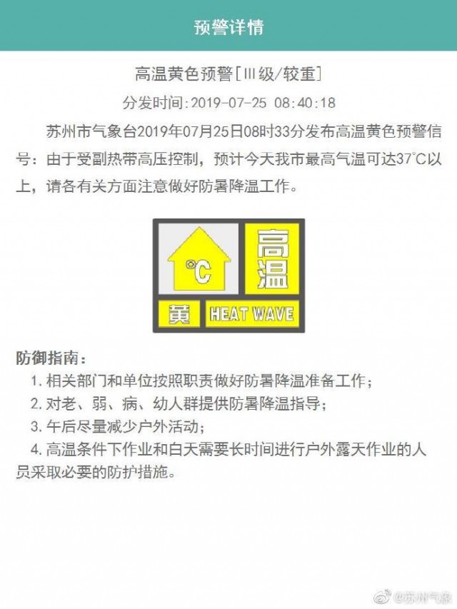 蘇州市氣象臺2019年07月25日08時33分發(fā)布高溫黃色預警信號:由于受副熱帶高壓控制,預計今天我市最高氣溫可達37℃以上,請各有關方面注意做好防暑降溫工作。