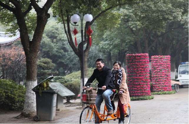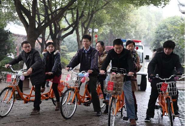 2月14日,吳江推出雙人公共自行車,分別投放于吳江公園和蘇州河,由于恰逢西方情人節(jié),所以借此機會,在吳江公園內(nèi)舉辦了“情侶同騎雙人公共自行車”的活動。12點58分活動按時進行,雖然陰雨蒙蒙,但經(jīng)過的情侶都會停下來看看這"稀罕"的雙人公共自行車,在工作人員的鼓勵下,情侶們紛紛踏著雙人自行車?yán)@著公園騎了起來。另外,只要試騎雙人公共自行車的情侶都可以領(lǐng)取工作人員準(zhǔn)備的玫瑰花和巧克力。