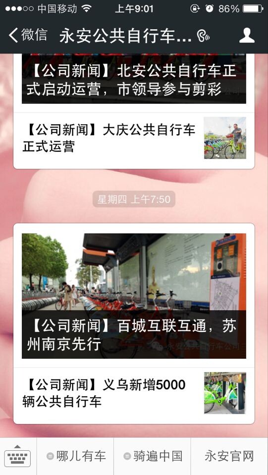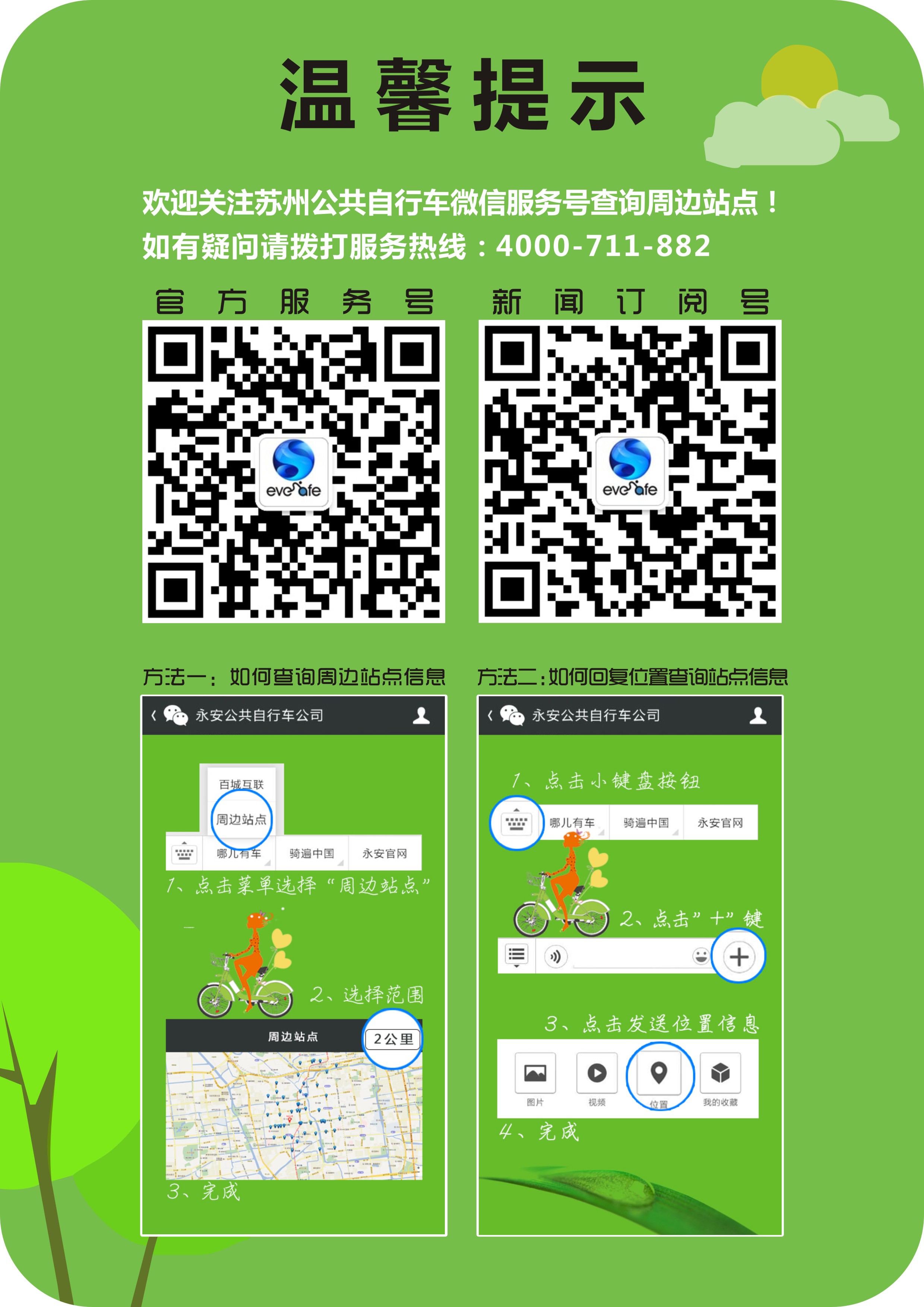 為了更方便市民借還公共自行車(chē),現(xiàn)總公司推出了通過(guò)手機(jī)微信快捷查詢(xún)公共自行車(chē)的借還狀況。微信號(hào):ibike668 微信名:永安公共自行車(chē)公司,手機(jī)掃二維碼也可加入。加入永安公共自行車(chē)微信之后,微信下方會(huì)顯示“哪兒有車(chē)”,周邊站點(diǎn)、地圖都能顯示,市民可以根據(jù)自身要求查詢(xún)所需要的信息。如下圖: