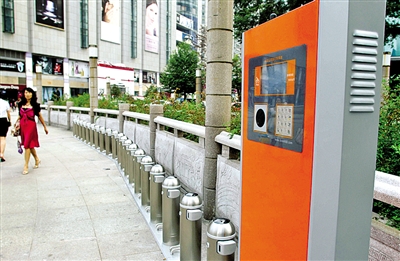 位于聯(lián)合廣場(chǎng)東側(cè)的大南門世貿(mào)大廈服務(wù)點(diǎn),是10個(gè)已建成的服務(wù)點(diǎn)之一。記者看到,這一服務(wù)點(diǎn)由一個(gè)橘黃色的控制器和20個(gè)鎖止器組成??刂破飨駛€(gè)大柜子,上面有刷卡區(qū)、按鍵區(qū)及顯示屏,可供市民查詢借車卡余額、附近服務(wù)點(diǎn)空位等信息。而鎖止器像一個(gè)樁子,實(shí)行每車一“樁”,頂部有刷卡區(qū)及車鎖,市民借車、還車時(shí),借車卡都要觸碰“樁”上的刷卡區(qū)。據(jù)悉,一輛公共自行車造價(jià)為500元,而一個(gè)鎖止器的價(jià)格為1400多元,一個(gè)控制柜的價(jià)格為5000多元。